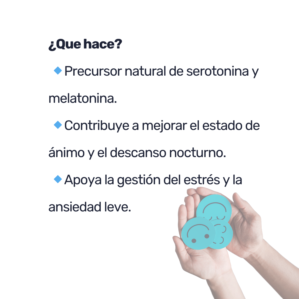 El L-triptófano es un aminoácido esencial necesario para la producción de proteínas y otros compuestos importantes en el cuerpo. Es conocido por su papel crucial en la síntesis de serotonina y melatonina, lo que lo convierte en un componente vital para el bienestar emocional y la regulación del sueño.